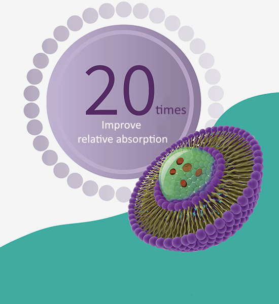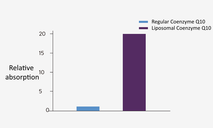 Em comparação com a coenzima Q10 regular, a coenzima Q10 lipossomal apresenta uma absorção relativa aproximadamente 50 vezes maior.