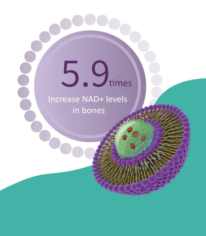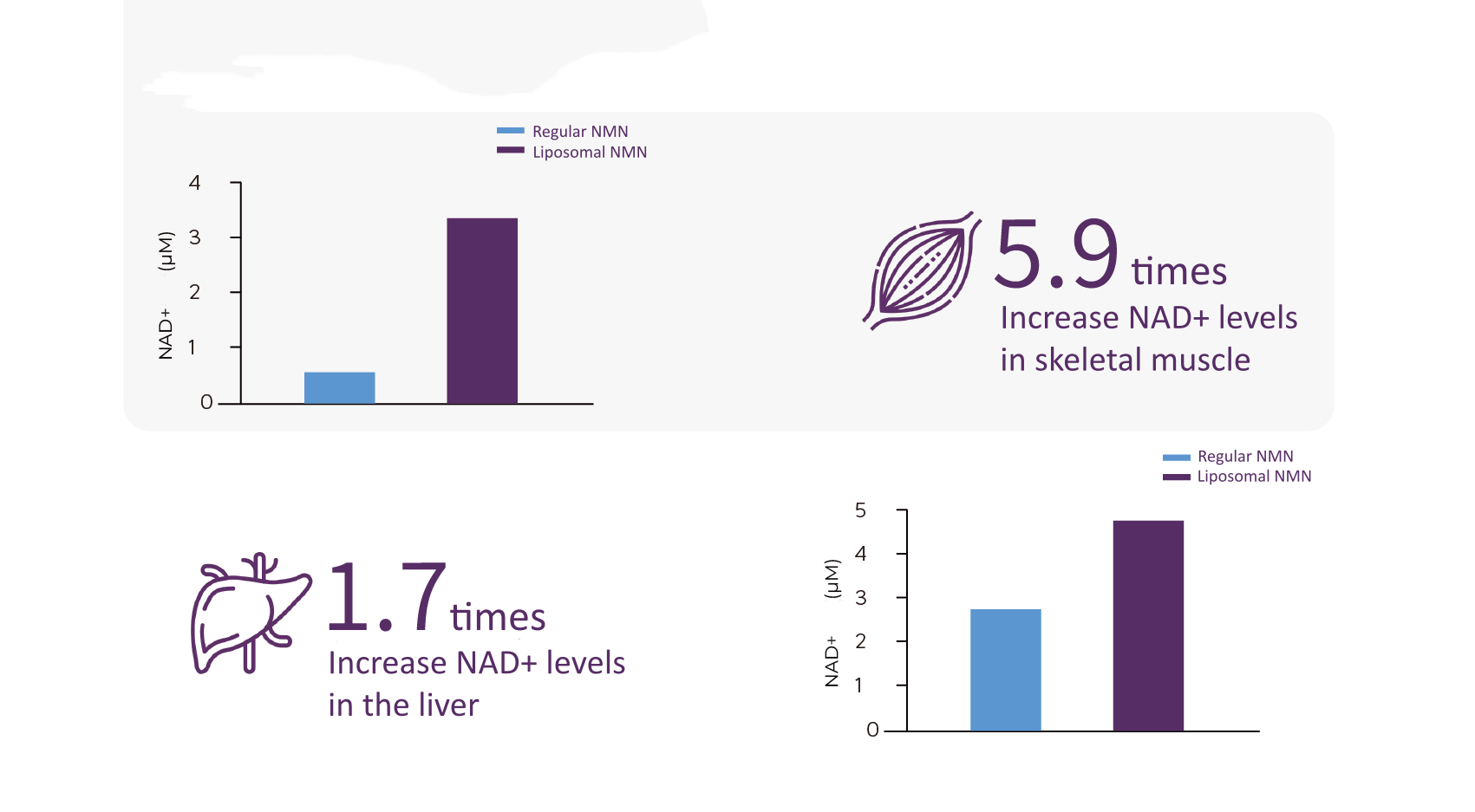Em comparação com o NAD+, o NMN lipossomal aumenta os níveis de NAD+ no músculo esquelético em 5,9 vezes.